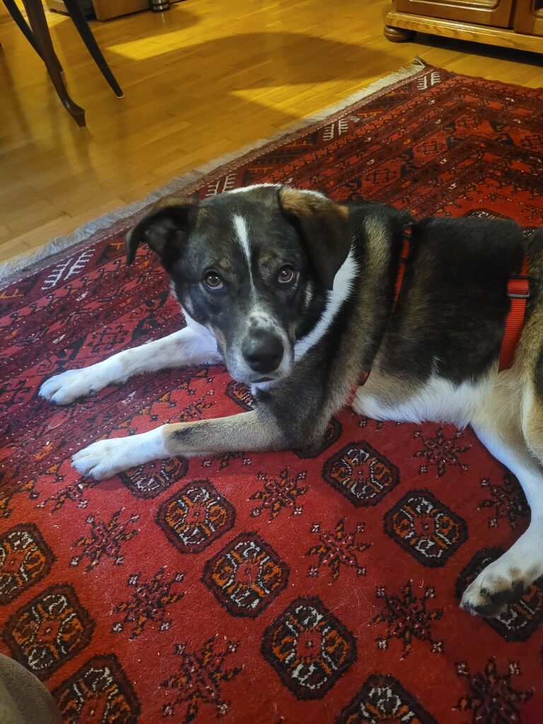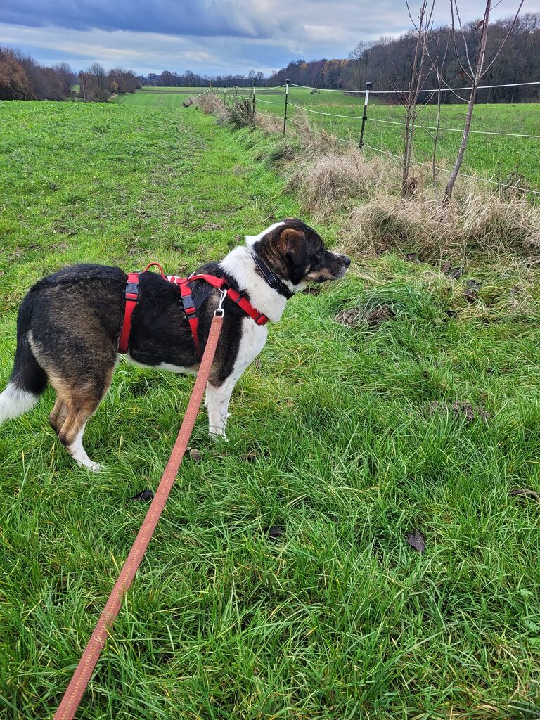 Kyra hat sich vom ersten Moment an offen und freundlich gezeigt, als hätte sie nie etwas anderes gekannt. Sie lässt sich problemlos Geschirr und Leine anlegen, läuft draußen ruhig und neugierig, begegnet neuen Eindrücken ohne Scheu und meistert Hundebegegnungen souverän.